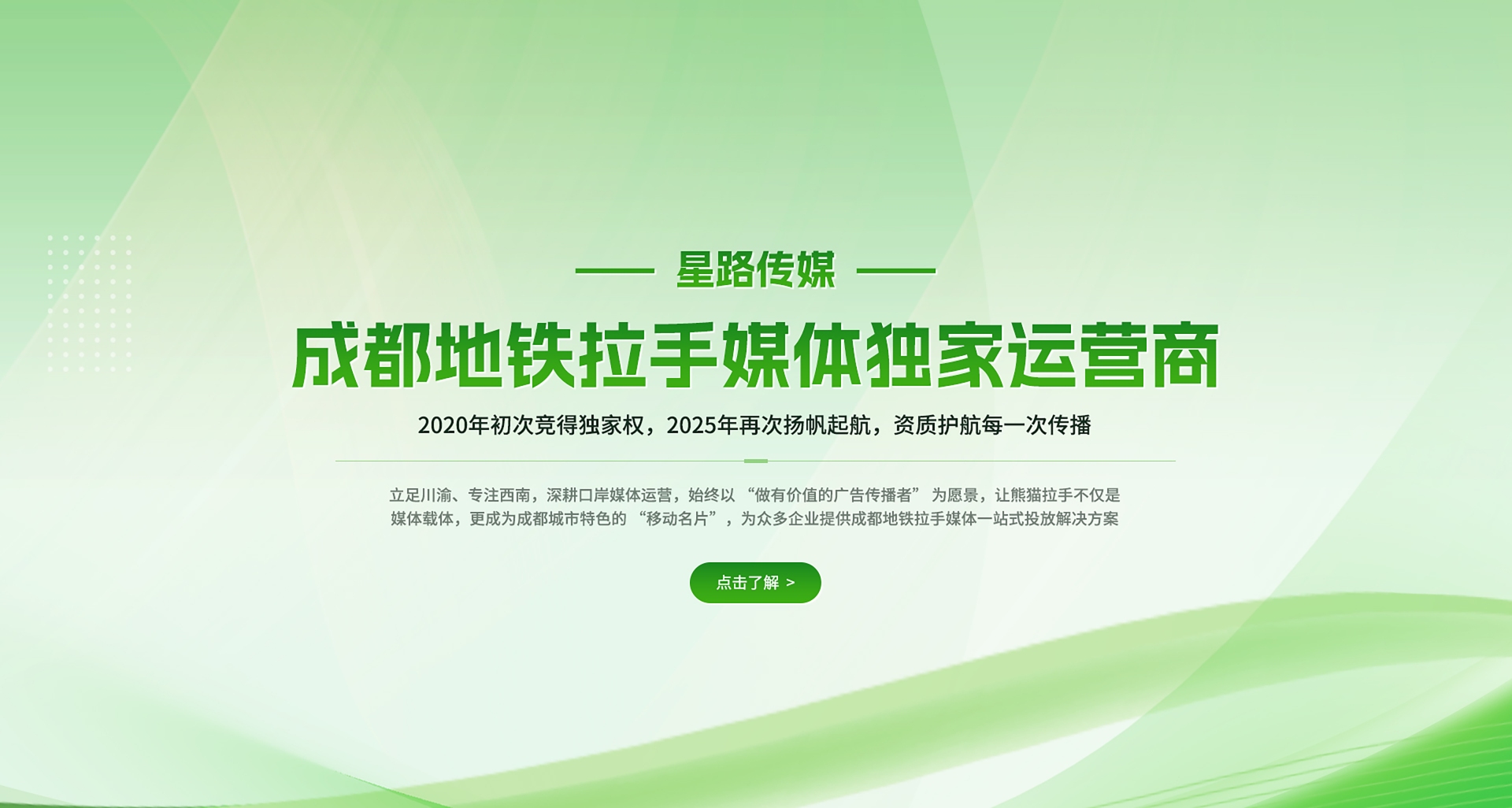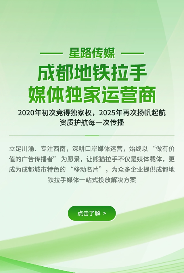 四川星路广告传媒有限公司创办于 2015 年,是国内知名的综合性大型广告传媒机构,独家运营成都地铁拉手媒体及全媒体整合传播,为客户提供 “从需求到落地” 的全流程服务。